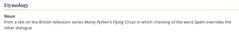 I was getting ready to write a post about SPAM, the canned meat, and I wanted to write a clever sentence bemoaning the fact that this delicious food has the same name as the hated junk email that clutters our inboxes when I learned this: